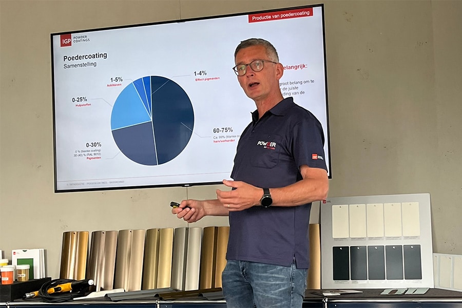 De dealerdag is mede tot stand gekomen op initiatief van IGP Powder Coating. In de workshop van deze Zwitserse poedercoatingproducent wordt tekst en uitleg gegeven over het productieproces en de verschillende kwaliteitsklassen die er bestaan op het gebied van poedercoating. Het verrast niemand dat ROMA hierbij standaard voor de allerhoogste kwaliteitsklasse kiest, te weten HochWetterFest – kortweg HWF. In zijn verhelderende toespraak verduidelijkt Technical Consultant Peter Wellenberg van IGP dat HWF een toonbeeld van duurzaamheid is. “Want hierdoor wordt niet alleen de levensduur van het gepoedercoate product verlengd, maar ook de reinigingsfrequentie gereduceerd. Dit heeft voor de eindgebruiker het voordeel dat de kosten van reiniging en onderhoud aanzienlijk worden verlaagd. Dat betekent ook dat er minder chemicaliën in omloop zijn om de reiniging te bewerkstelligen. Daardoor is HWF méér mens- en milieuvriendelijk.”
